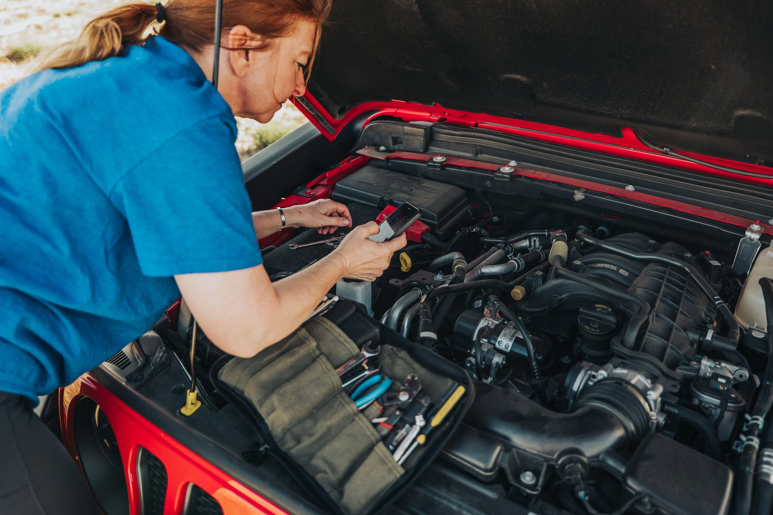 Using the pre-drive checklist, Connie Rodman uses the Overland Glovebox Guide app to look over Sand Ship Discovery II, a Jeep JL370 Wrangler. Photo: Matthew Ritscher